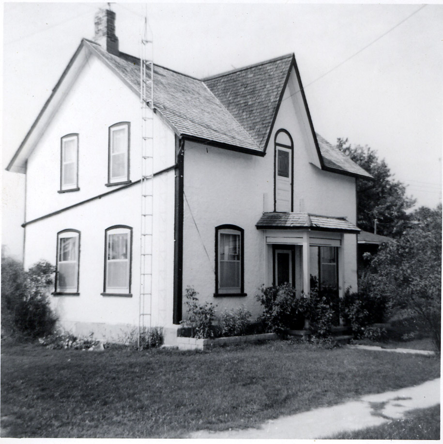 Photo of the exterior of the home of Mr. and Mrs. Bob and Florence Leonard on King St. in Cookstown. Originally a two-storey beige stucco home, the building changed hands numerous times after its original construction in the 1880s. The Leonards purchased the home in 1965, and severed their long lot to sell the west half to Leonard McAfee. At some point in the second half of the 20th century an addition was added to the rear of the home. The exterior was later painted blue. The photo shows the house as white with dark trim surrounding the windows, with a small porch over the front door that doubles as a balcony from the second floor.