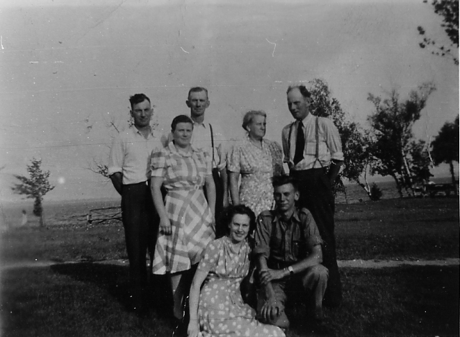 Taken 1942, just before Howard Stewart went overseas. Back row L to R: Willard Stewart, father Robert Stewart. Middle: Bertha (Stewart) Jory, Mother Alda Stewart, Russell Stewart Front: Marian (Stewart) Ferguson, Thomas Howard Stewart. Costumes.