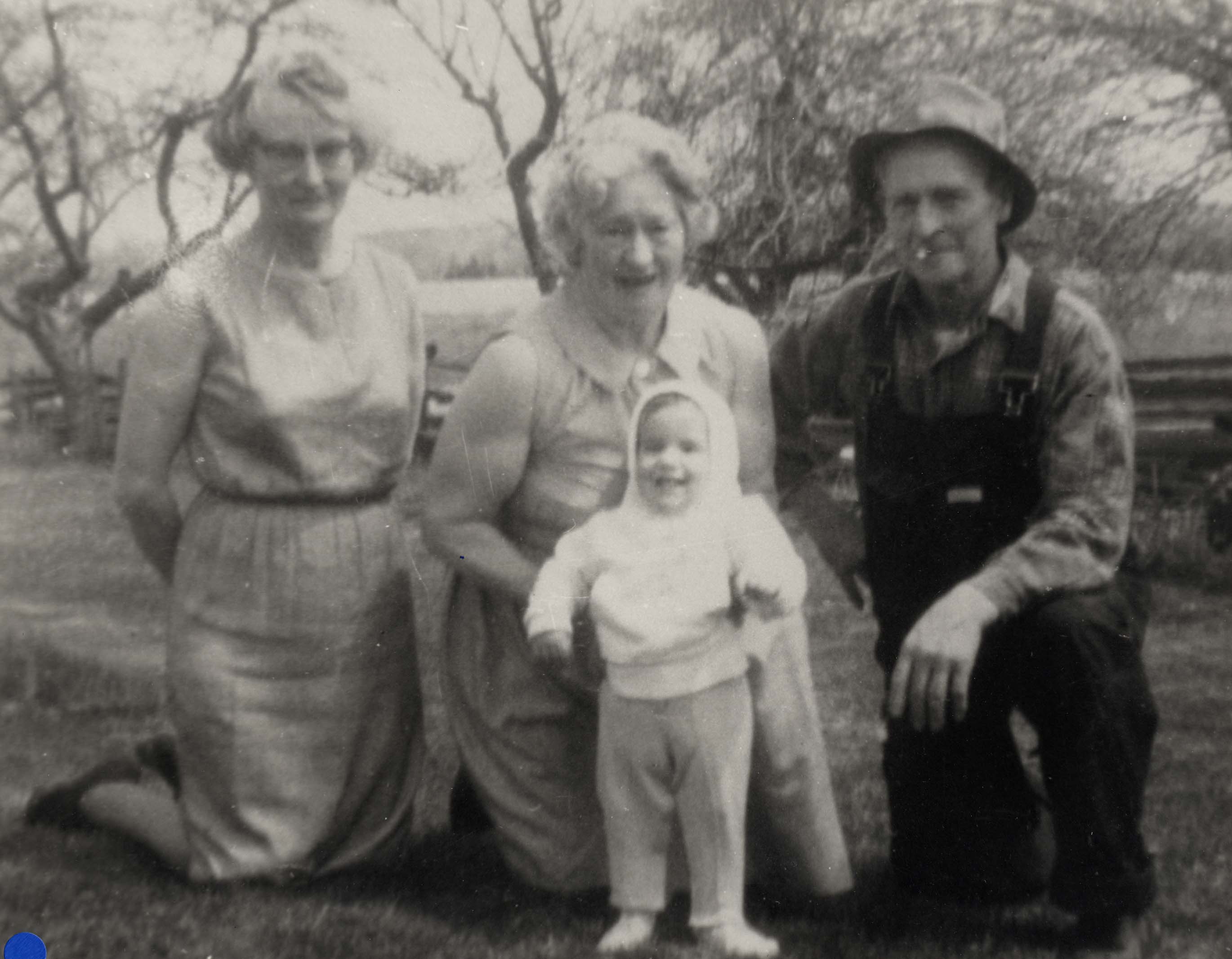 Black and white image of three adults kneeling on the ground with a smiling baby standing in front of them. Pictured on the left is Betty O'Connell, with her sister Florence Coughlin in the middle, and her brother Timothy O'Connell on the right. The baby is Darcy Thomas, Miss O'Connell's Great Nephew. The two ladies are wearing dresses, the gentleman in overalls and wearing a hat, and the baby is wearing a white hooded sweatshirt and smiling.