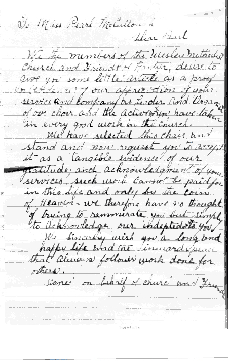 Letter to: Pearl McCullough- when she left to be married. Leader and organist of Nantyr Methodist church.