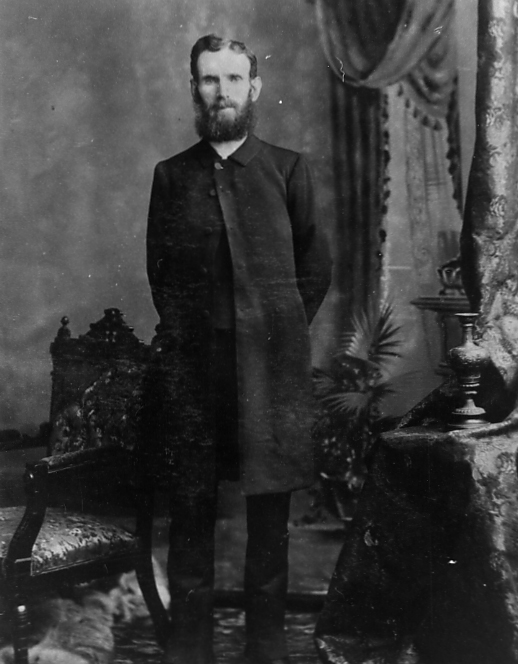 Methodist Minister Rev. John Power, husband of Mrs. Eva Power (formerly Eva McCullough) Note interior decor, costume
