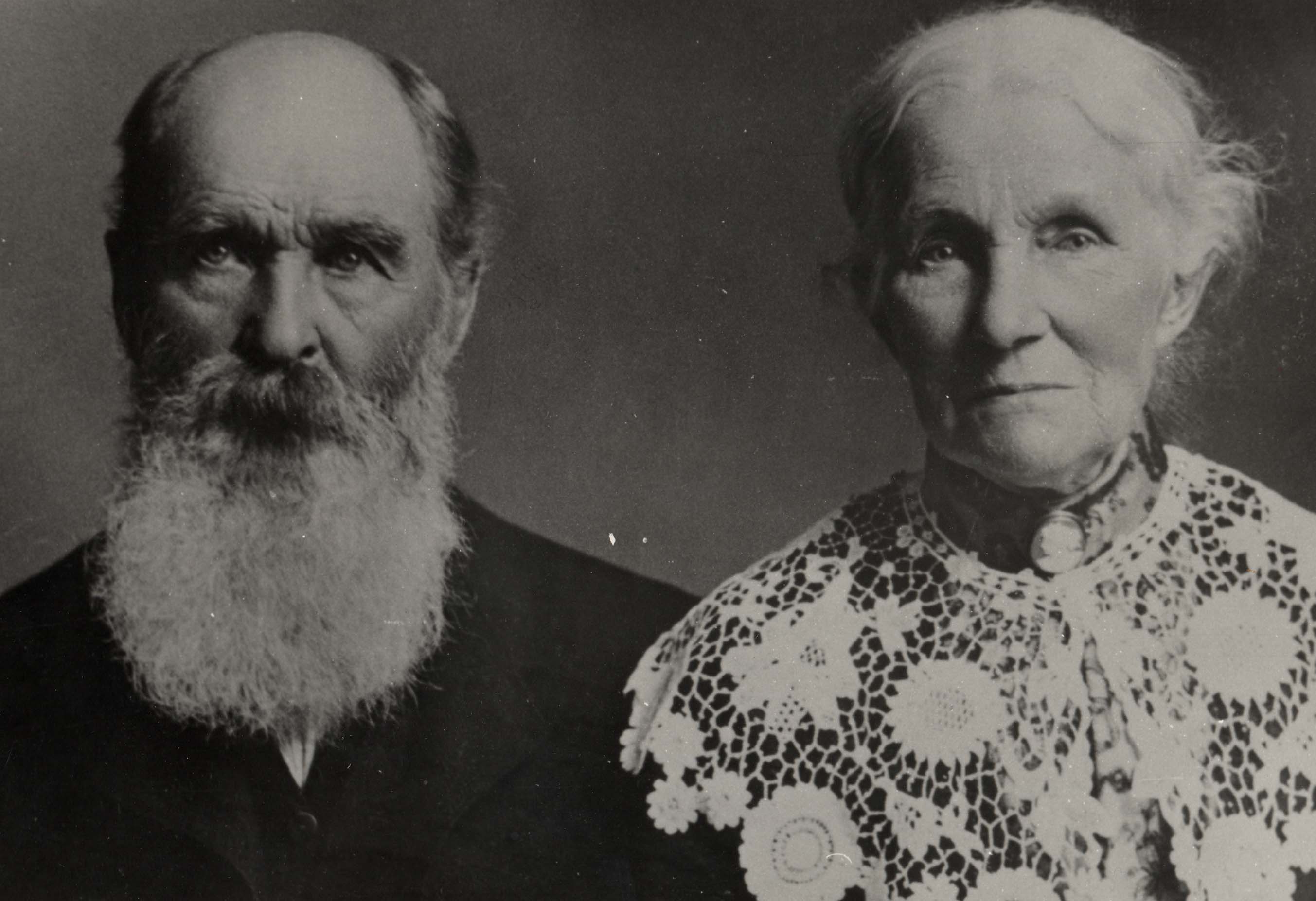 Mr. and Mrs. John Quantz, nee Mary Pratt. Mrs. Quantz was born in "salt box" in London, England. She was eleven years old when she came to Innisfil about 1835 to NH Lot 16, Concession 11. They were married aboout 1842 and are buried in St. Paul's cemetery. Through error names not on tombstone of Beverley Quantz. COSTUMES AND CLOTHING