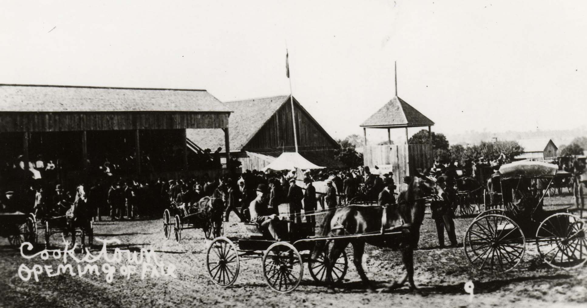 Photo of the Cookstown Fair Grounds in 1912. Pictured in the photo on the left is the grandstand, with the drill hall in the middle, which was also called the exhibit hall and Reed's Dance Hall. The building on the right was the Judges' Stand for Standardbred horse races. The Hall was used for dances with Johnny Gilheeney's All Girls Orchestra. A large crowd is pictured in front of the stands with horse drawn carriages and buggies in the foreground.