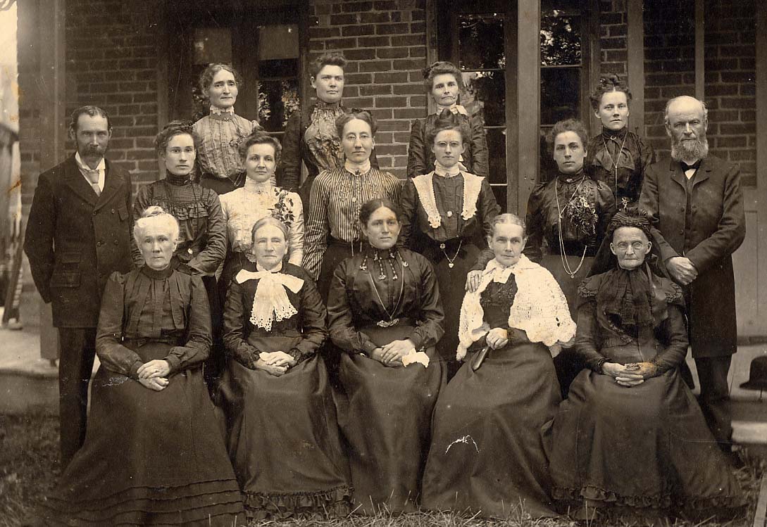 Picture taken in 1902. Miss Levitt was a Deaconess. Front Row: Left to right - Mrs. Tom Fisher, Mrs. Foster (Granny), Mrs. John Kidd, Mrs. Rev. Simpson, Mrs. Fisher Sr. Middle Row: W.J. Findlay, Mrs. Gauley (Mabel Fisher), Mrs. M.J. Eby, Miss Levitt, Mrs. John Willoughby, Mrs. Orlando Lewis, Rev. C.A. Simpson. Back Row: Mrs. Alex Arnold, Mrs. Boynton, Mrs. Fred Fisher, Mrs. Alex Banting.