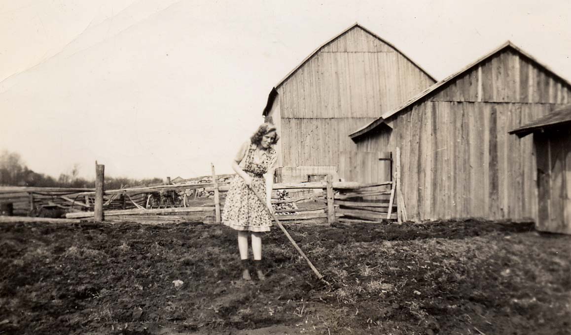 Black-and-white photograph of a young woman in a patterned dress working with a tool in a muddy farmyard. She stands with her head down, tilling the soil. Behind her are wooden fences and two large barns. A third, smaller building is partially visible on the right edge of the frame. Open pastures and trees are visible in the distance.