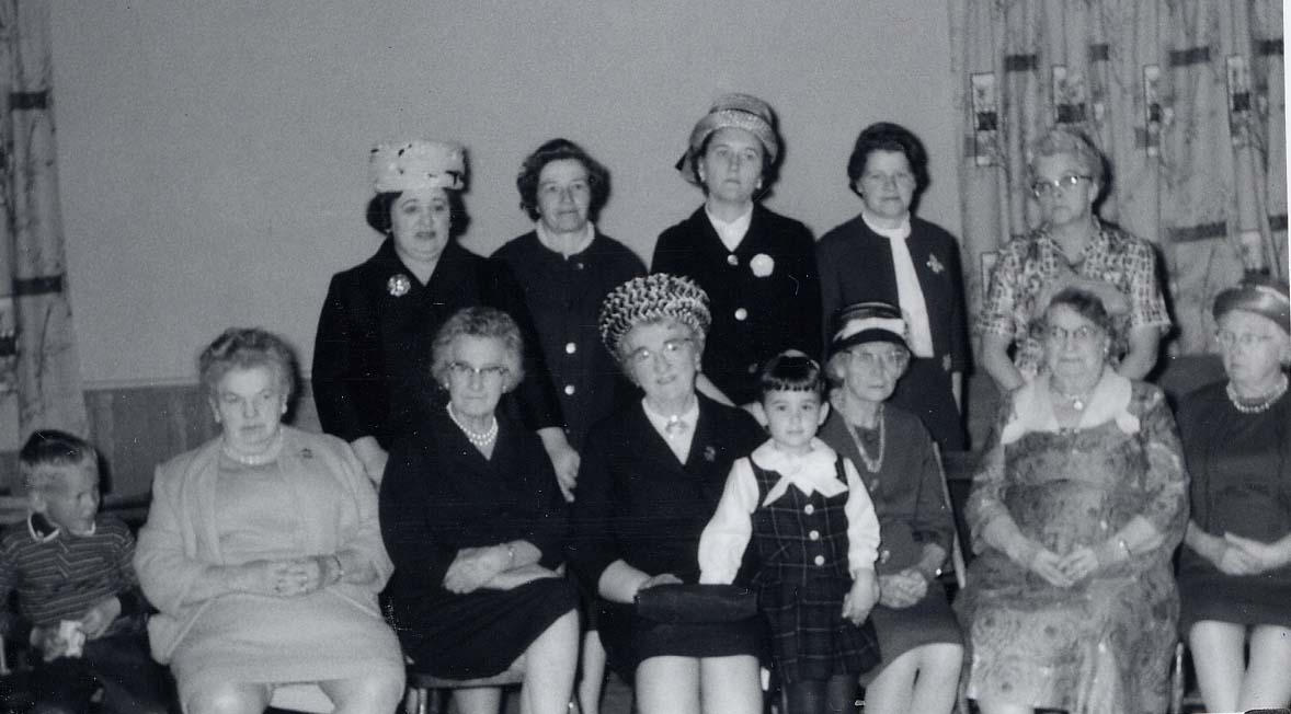 Group photo taken during the Cookstown Women's Institute 70th Anniversary celebration. The ladies pictured are seated or standing in two rows indoors, with some floral patterned drapes visible in the background. Pictured from left to right, front row: Ronnie Riley, Eva Patton, Josena Kidd, Jessie Monkman, Elva Leadley, Elsie Couse, Mabel Fidler, and Kathy Monkman standing between Jessie and Elva. Back row: Anne Monkman, Olive Parker, Shirley Riley, Lena Lund, and Hazel Trotter.