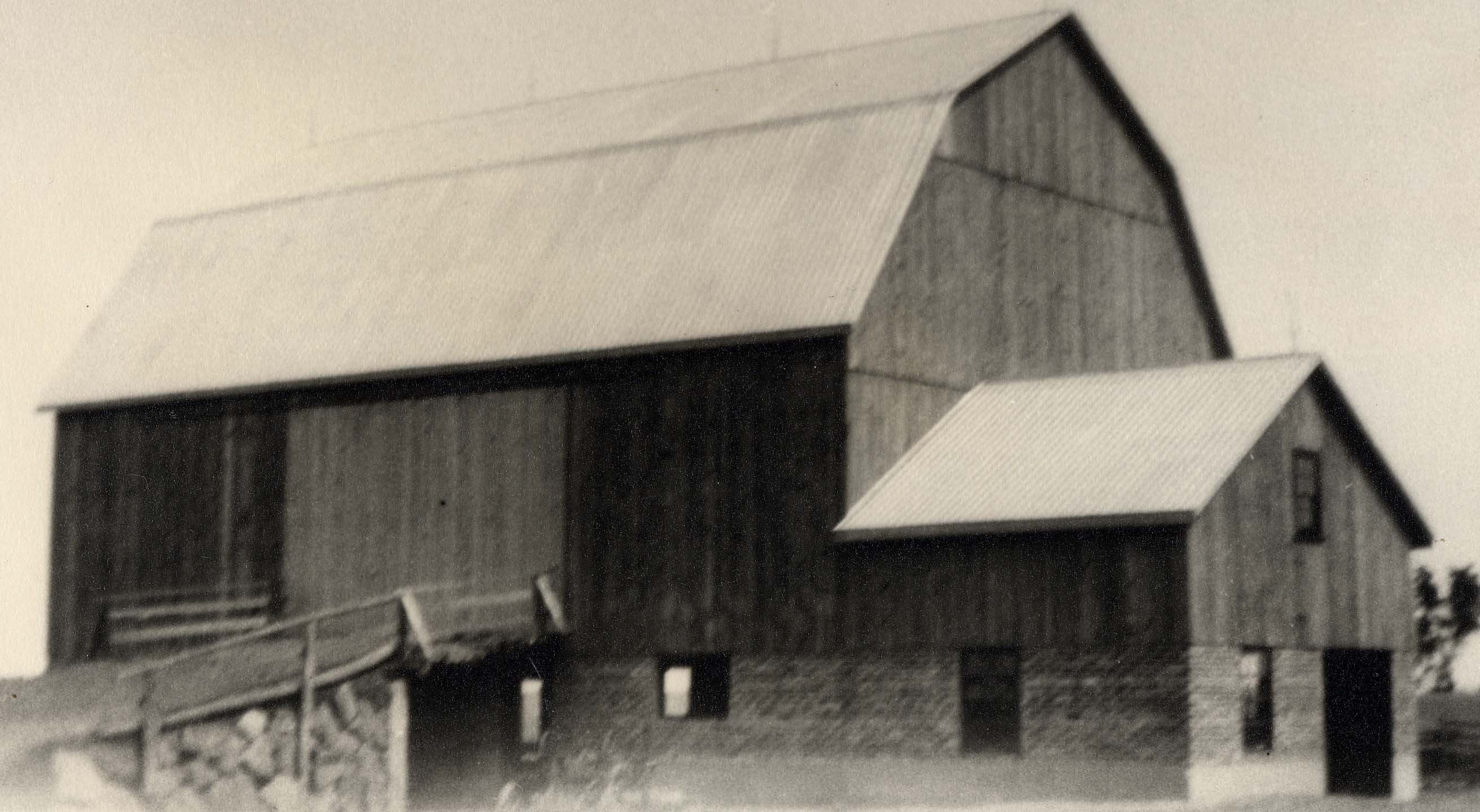 This barn was raised by hand, one of the last in the area, at the farm of Mr. Willis Corrigan in Innisfil Township in 1930. The bricks for the basement foundation were brought from the old Coulter Hotel in Cookstown. Wooden pegs were used instead of nails for the framework. See writeup for complete details of this feat!