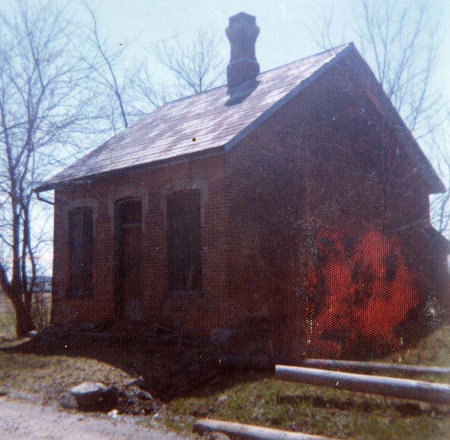 Photo of the exterior of Cookstown's lock-up, which was constructed in 1877 as a second class jail containing three cells and a toilet room. The idea for the lock-up was originally proposed in 1865 and was granted $200 by the County Council towards its construction in 1868. After the railroad was built in Cookstown in 1879 the lock-up received an additional $400 to help contain transients who came in and out of town via train. The building went unused for a number of years as criminals and transients were taken to the Barrie jail. The deed to the building was eventually given to the municipality, and later traded to George Caldwell. The building was then rented for storage at a cost of $40 a year. By 1973 local residents began a movement to have the building designated as an historic site but high costs to bring it up to building codes meant the building fell into disrepair. By 1983 the building was entirely dismantled. This colour photo shows the exterior of the small red brick building as it was in the 1970s with an open gable roof, single chimney, and two windows flanking either side of the only door.