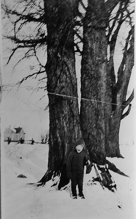 Elm trees at Robert Duncan's farm on the roadside (Third Line) Innisfil was noted for its stands of elm trees along roadsides and fence rows until hit by Dutch Elm disease, starting about 1960 Pictured, Billy Duncan. Duncan, William. Sleds and sleighs