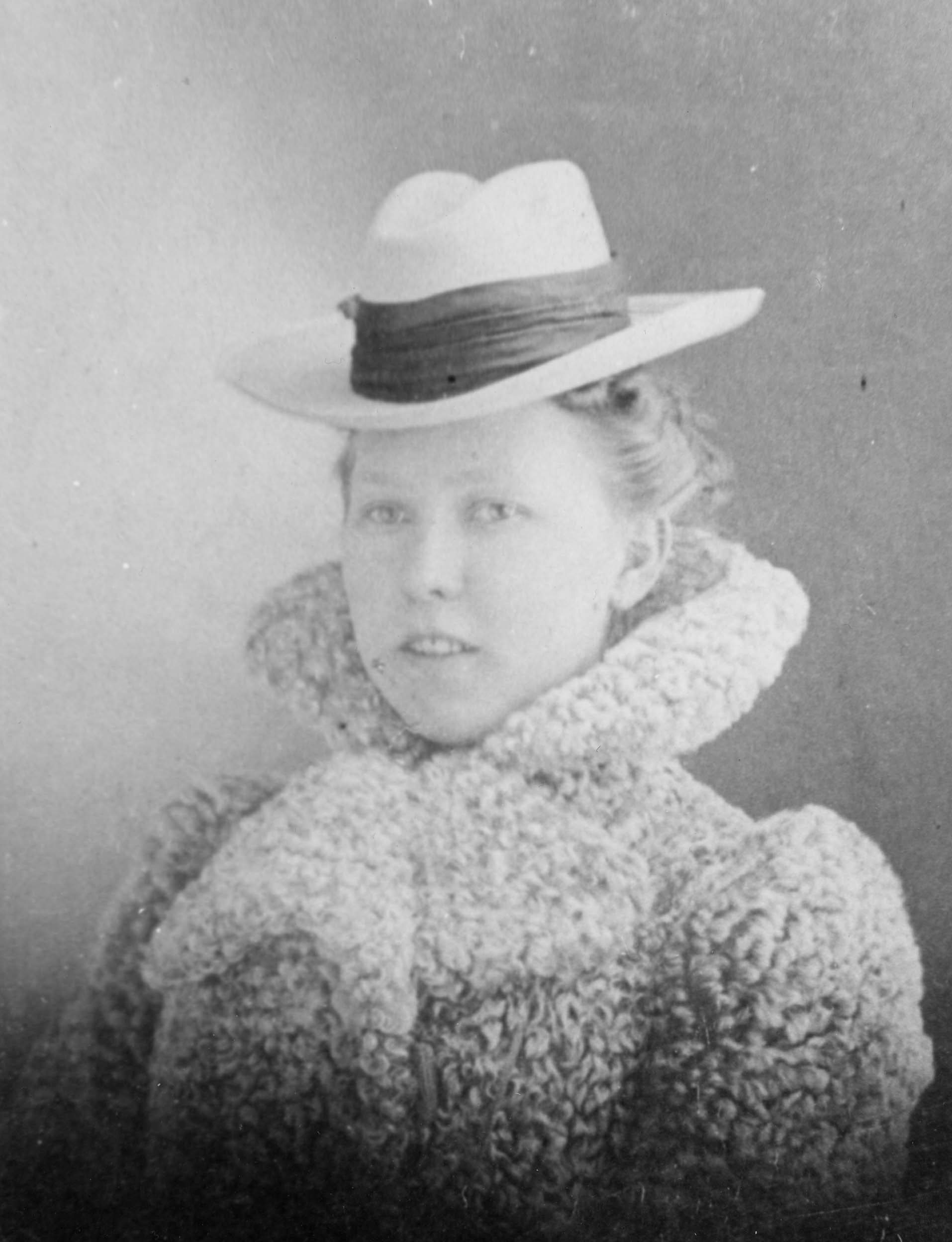 Portrait photo of Libbie Sawyer of Innisfil Township. Later she was Mrs. Hand of Bradford, the mother of Orville Hand and Norman Arthur Leslie Hand. She is wearing a distinctive high collared coat and a unique hat.