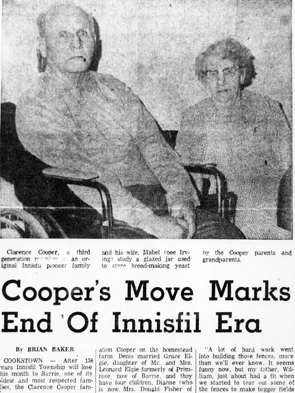 Newspaper clipping from The Barrie Examiner, an article on the Coopers of Bethesday by Brian Baker. PIONEER LIFE AND RECOLLECTIONS #1963 The remainder of the newspaper article is at the Document Centre.