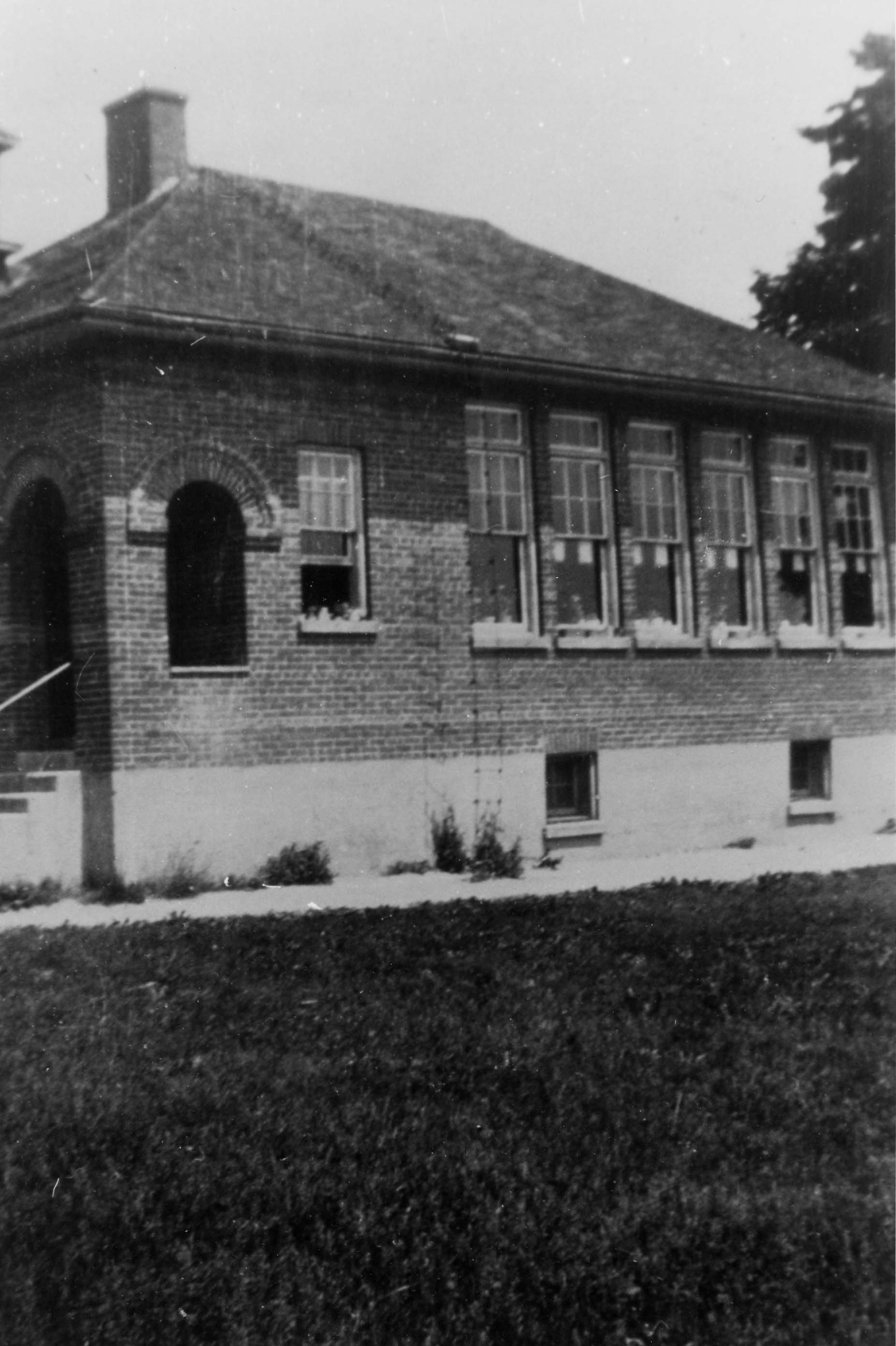 Photo of Bethesda School building, located on the North Half of Lot 6, Concession #3, known as SS #2. The image depicts a brick building with arched windows near the portico, with several squared windows along the length of the building.