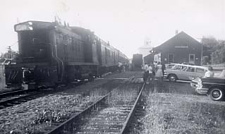 Photograph showing a crowd of people waiting beside their cars at the Cookstown train station for their mail delivery. The cars appear to date from the 1940s or 1950s. Two tracks are visible passing directly in front of the station, and the train itself is stopped on the track farthest from the station. The station was originally built sometime around 1877 when the Hamilton & North-Western Railway was built from Hamilton to Allandale. The building was later absorbed into a semi-detached residence located on Wellington Street. Two passenger trains passed through Cookstown twice daily six days a week: once at 10:20 a.m. northbound to Meaford via Allandale, and a southbound train stopping in Cookstown at 5:02 p.m. Freight trains stopped once daily for grain or coal. The station closed in April 1967 as rail service declined in popularity.