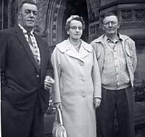 Image taken in 1961 on Victoria Street West in Cookstown. Three people are seen standing together in the image. Pictured form left to right: Art Hanson, Marjorie Hanson, Bill Riley. Mr. Hanson is dressed in a suit, Mrs. Hanson is dressed in a formal coat and hat, and Mr. Riley is wearing a button-up shirt with casual jacket. This photo was collected by Cookstown Tweedsmuir History.