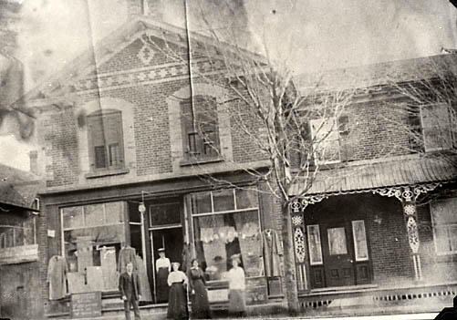Picture taken about 1920 - Harry Fisher's Store Shown here Mr. Harry Fisher, Mrs. Marling, Mrs. Hopper (Miss Elsie Jenkins) and later Mrs. J.R. Couse, Mrs. Theodore McMillan, the banker's wife. Donated by Mrs. L. Magloughlen (Marie Spindloe).