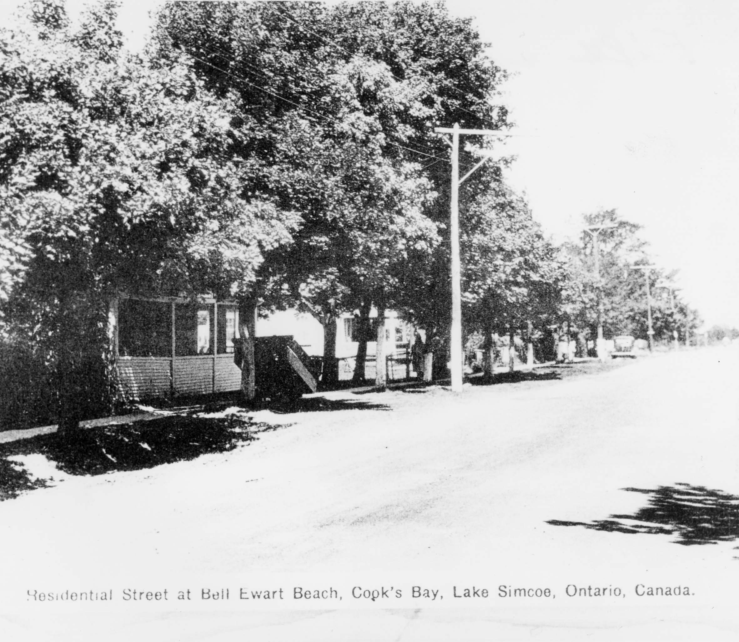 Postcard of Wisker Avenue labelled "Residential Street, at Bell Ewart Beach, Cook's Bay, Lake Simcoe, Ontario, Canada." The image depicts a view of the road with a number of buildings on the left side, mostly covered by trees, with power/telephone lines running parallel to the street. Fred Quantz worked on the construction of ten summer cottages on this street in 1931.
