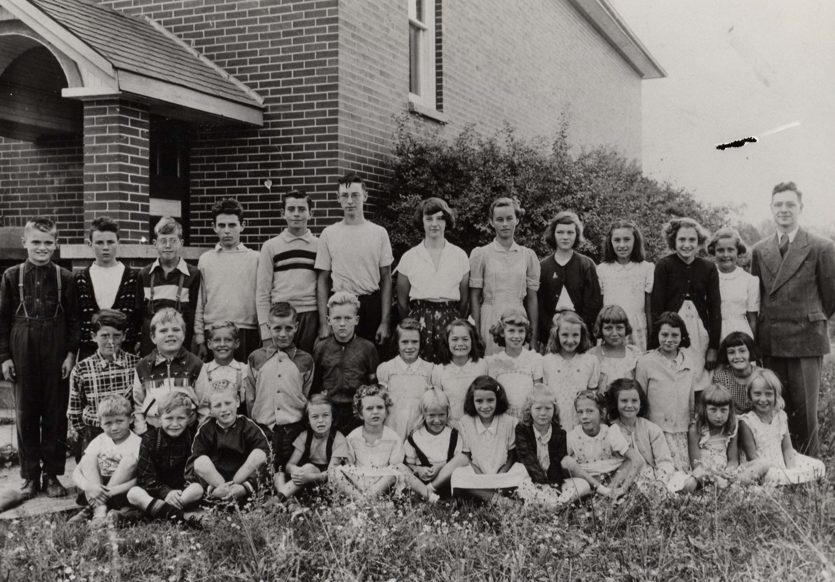 Back row left to right: John Goodfellow, Bob Campbell, Dennis Thompson, Beverly Smith, David Neely, Jack Pratt, Edna Mae Spring, Enid Callow, Anna Connell, Phyllis Sproule Doreen Boyd, Carolyn Carscadden, Robert Flear, Teacher.