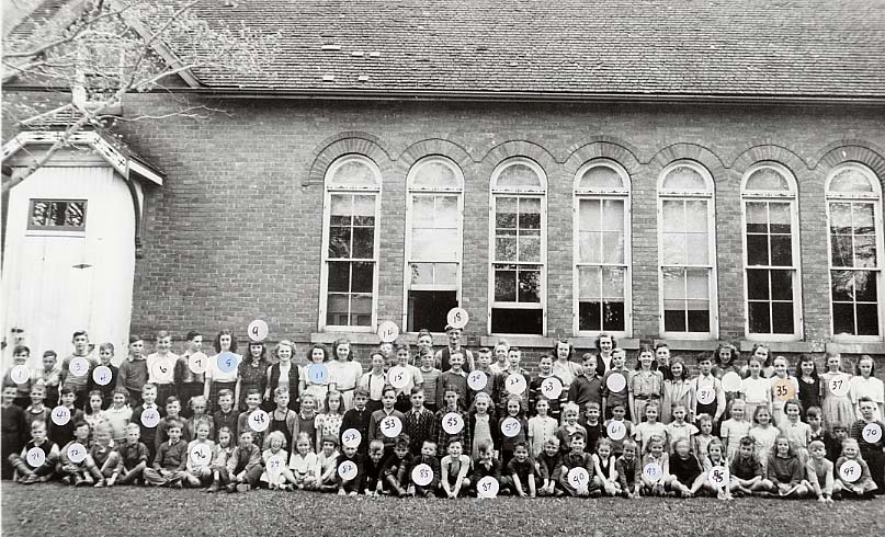 Group photo of the students of Cookstown Public School for the 1946-1947 school year. The students are seated, kneeling, or standing in three rows alongside the school building and just below the rounded-arch windows. Small numbered circles have been affixed to some students as a method of identification but the list of names has since been lost.