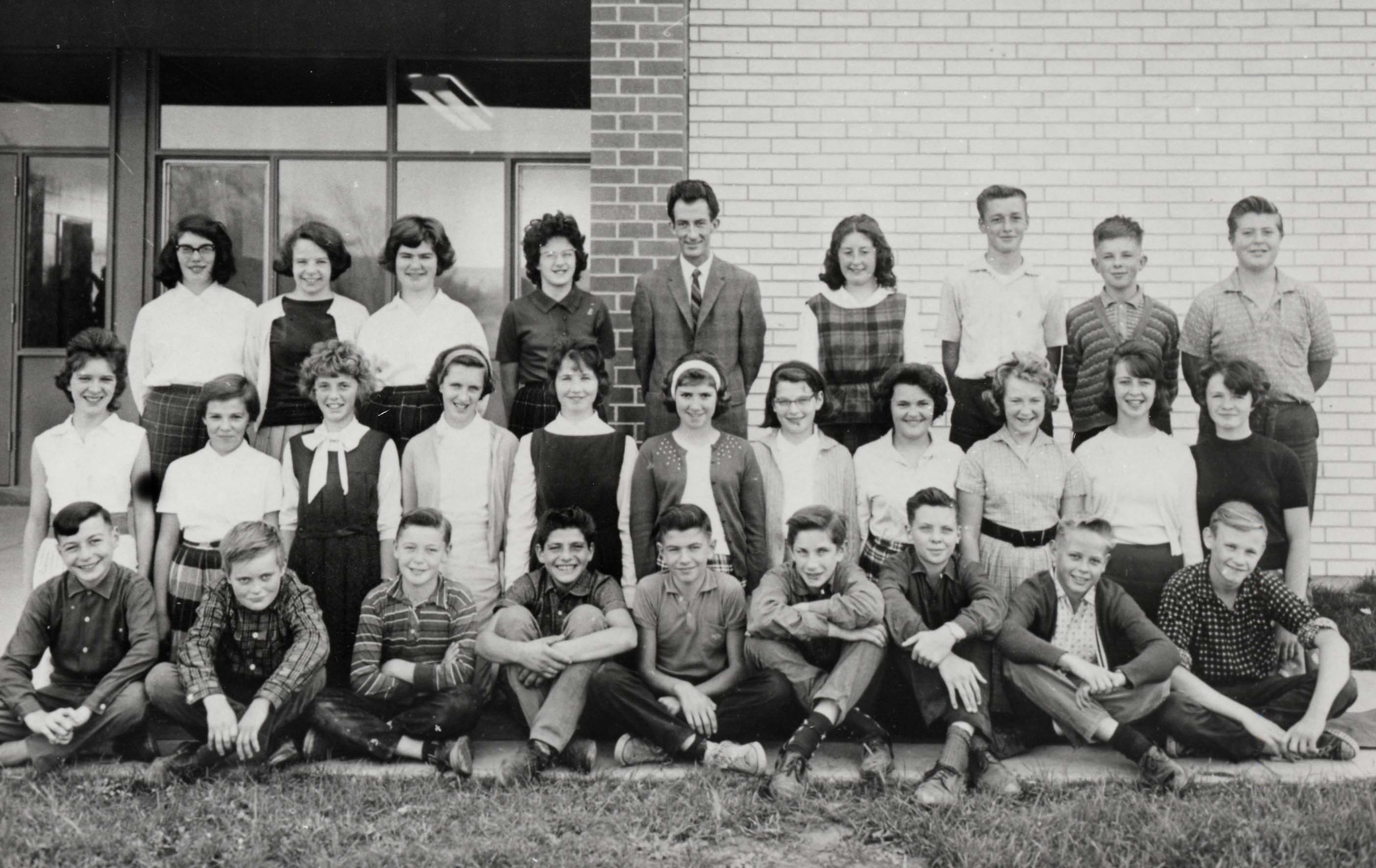 Grade 7 and 8 under Lindsay Bell as teacher. Taken the first year Innisfil Central School was opened. Back row: (l to r) Mary Ann Burns, Nancy Biggs, Dianne McQuarrie, Juliana Kempers, Lindsay Bell, Karen Hooper, Gary Keown, George Vasiliauskas, Bill Akers. Middle Row: Shirley Marling, Sandra Jones, Pattie Keown, Marie Hillock, Dale Squibb, Bonnie Rainey, Beverly Beatty, Colleen Barrett, Janet McQuarrie, Carol Comeau, Diane Cooper. Front Row: Bob Beatty, David Jonah, John Wyers, Vincent Adransani, Douglas Kell, william Rainey, Walter Kellough, Kent Sturgeon, Wayne McKinnon.