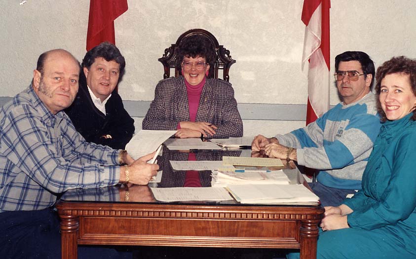 Photo of the Cookstown Council in 1990 seated around a carved wooden table with the flags of Canada and Ontario visible in the background. Pictured from left to right are: Brian Ashley, Larry Wright, Reeve Edyth Brown, John Owen, and Liliane Spence.
