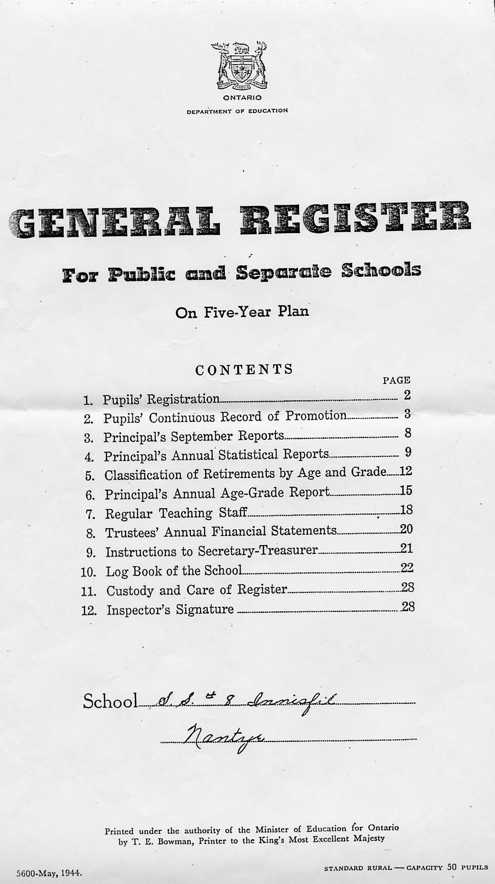 General Register for Public and Separate Schools. Nantyr School SS #8. Conc7 - Sideroad 20.