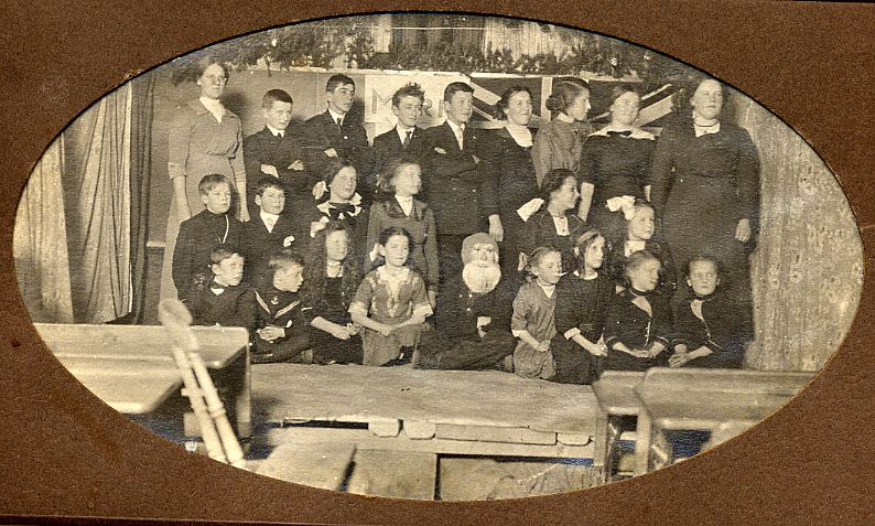 Group photograph taken on stage, likely from a school play, on an unknown date. The photo shows a group of children either sitting or standing in three rows, with two adult women on either side of the back row. The girls are all wearing dresses and the boys are in suits. A boy in the centre of the front row is wearing a hat and a white beard with white eyebrows suggesting it could have been a Christmas play.