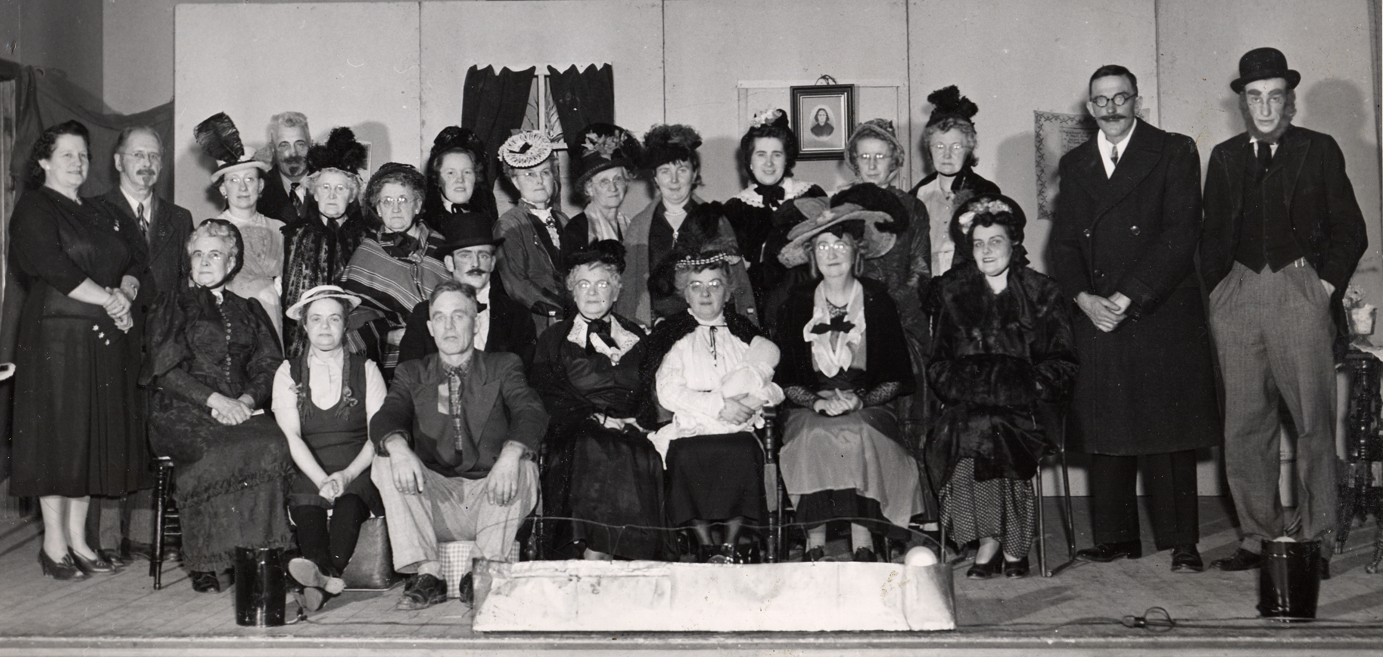 Cast of the Play "An Old Fashioned Mother" about 1953 (sic c. 1942), on the stage at the Cookstown Town Hall. This play was put on about 30 times around Simcoe County, in Violet Hill, Creemore, Avening, Stroud. It was put on in the Spring and Summer, and Mr. Hubert Lemmon said the cast had the time of their lives doing it. Seated left to right - Mrs. Bernice Graham, Ethel Jebb (as Suki), Hubert Lemmon, (behind Mr. Lemmon, Earl Gilroy), Mrs. J.R. Couse, Mrs. Chas. Carr, Mrs. J. Faris, and Mrs. Margaret White. Back Row - Mrs. Albert Gilroy, Mr. M.E. McFadden, Miss Irene McMaster, Mr. J.R. Couse, Miss Mabel Chantler, Mrs. W.J. McMaster, Muriel Corrigan, Mrs. Russell Draper, Mrs. R.W. Glass, Mrs. Myrtle Westlake, Mrs. Garnet (Florence) Ley, Mrs. Jack (Eileen) Coutts, Mrs. A.J. Lewis, Wesley Hindle, and George White.