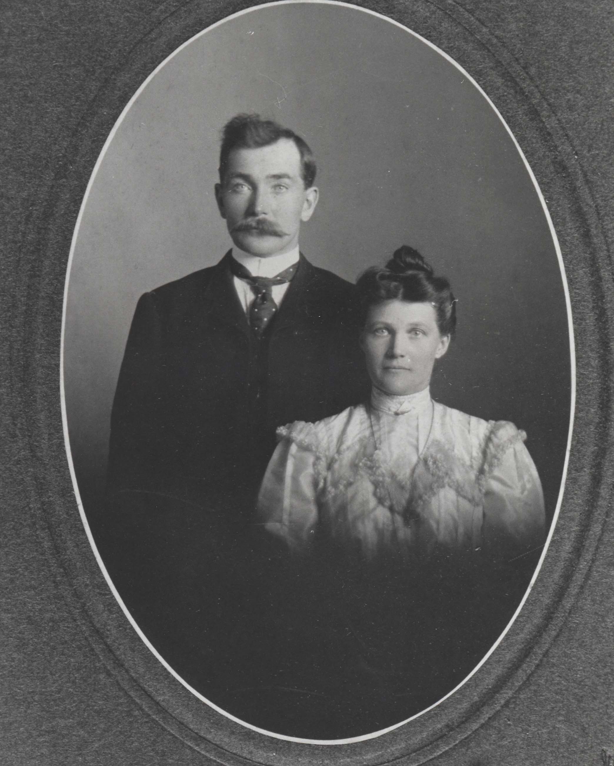 Studio portrait of William Robertson and his wife, Marjorie Ness. William was born in 1874 and died in 1967, and Marjorie was born in 1877 and died in 1967. They married in January of 1904, and never had children.William was the son of William Robertson and Mary Cook, and Marjorie was the daughter of Alexander Ness.
