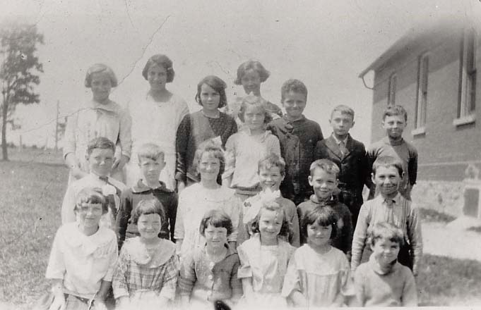 Back Row L to R: Addie Alpin, Marjorie Reid, Mina Henry, Florence Walt (and behind her, Teacher: Birdie Warnica), Bruce Wice, Tom Bowman, Parker Kelcey Middle Row: Jack Reynolds, Kenneth Mann, Marjorie Bowman, Reginald Tanner, John Henry, Alex Boyd. Front Row: Nancy Reynolds, Audrey Bowman, Francis Bowman, Patricia Mann, Marjorie Bain, Earl Bain