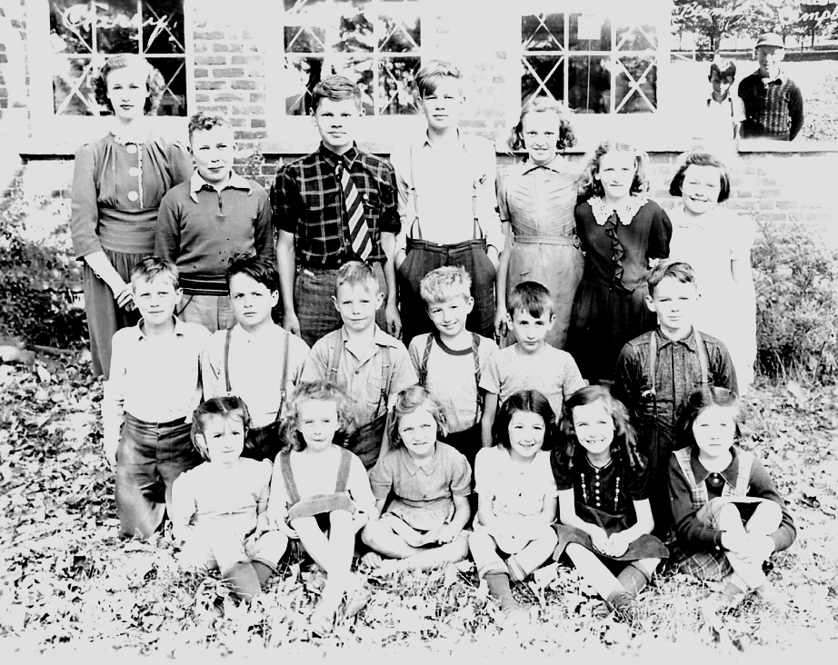 Back row (l to r): Ethel Todd (teacher), Bob Hughes, Keith Sinclair, Sinclair Nevils, Mary Nevils, Sylvia Kell, Margaret Campbell Centre Row: Ken Nevils, Elwood Nevils, Roger Sturgeon, Donald Sawyer, Douglas Sawyer, Douglas Beamish Front row: Margaret Sawyer, Lida Beamish, Jean Matchett, Grace Sawyer, Edith Kell, Glenna Stewart Insert - Stewart Beamish, Malcolm Campbell Schools