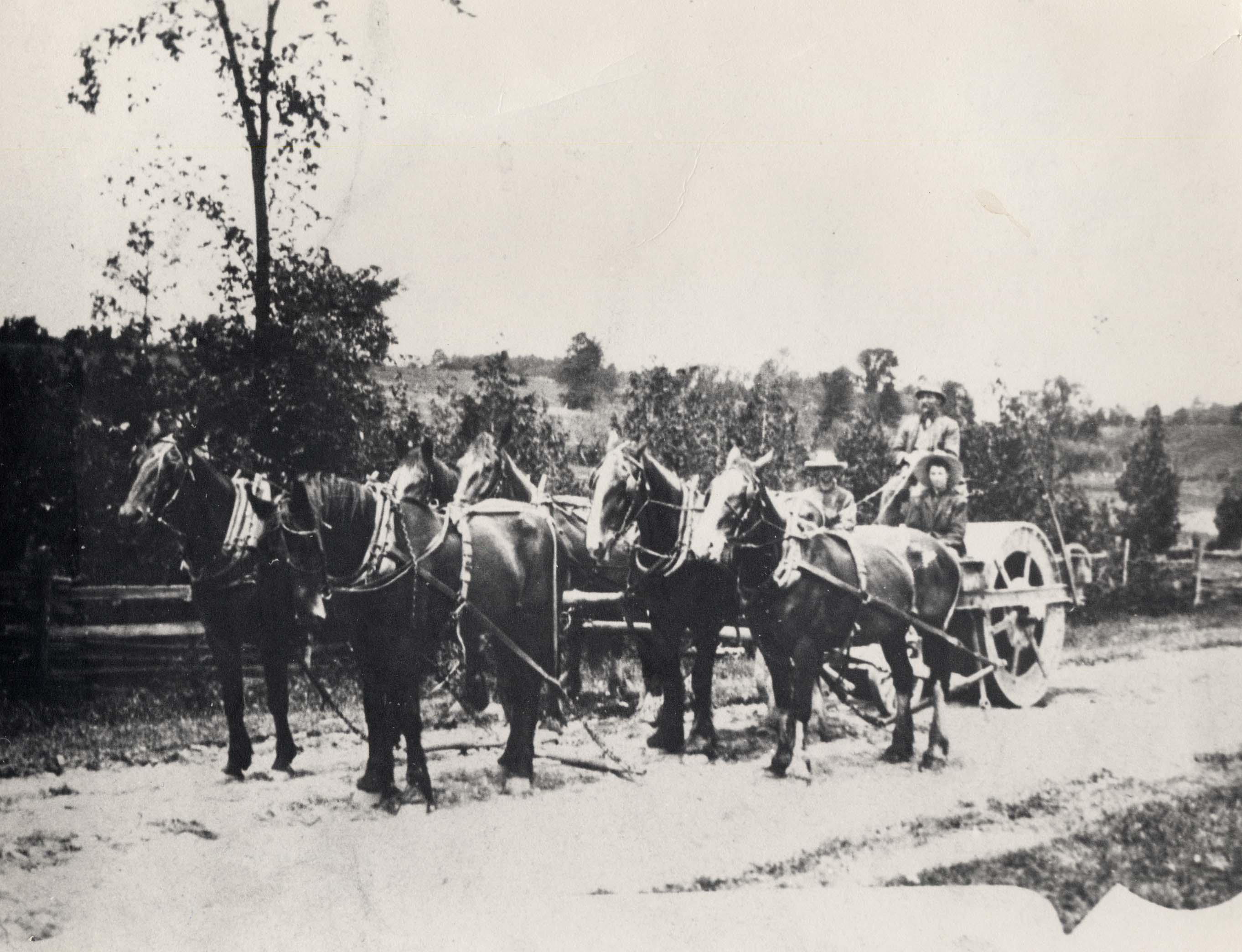 Doing roadwork to Tollendal. S. Blackmore and Fred Warnica driving horses. This is showing how roadwork was done then. Roads - maintenance Animals, horses