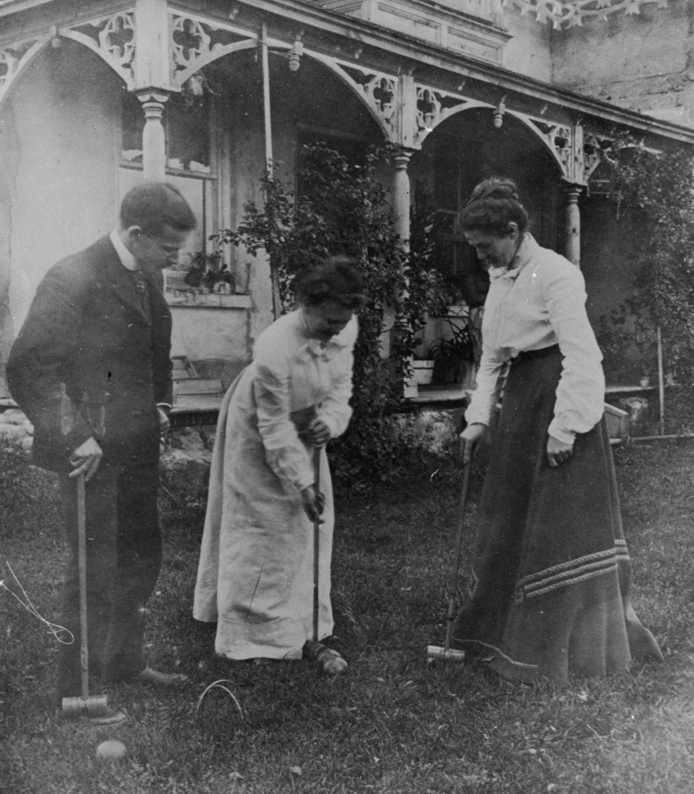 Croquet played on the Beatty homestead lawn. The man of the left is unidentified, and the two ladies are unidentified Beatty sisters.