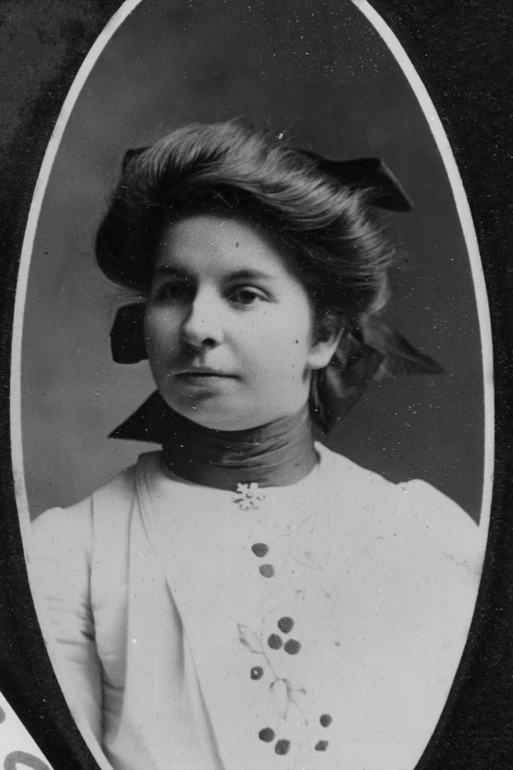 A studio portrait of Annie Sawyer (Née Simpkins) taken at 18 years old, in 1904. Annie is wearing a white high-neck blouse. The front of the blouse appears to be decorated with embroidery. She wears an ascot around her neck which has a small snowflake at the bottom. Her hair is tied up with ribbons. Annie Sawyer was first cousin to Edna Allan.