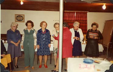 Mrs. Anne Monkman presenting 25 year gifts to Women's Institute members Mrs. Hazel Trotter, Mrs. Muriel Smith, Mrs. Alice Baker, Mrs. Lizzie Donnell, Mrs. Monkman (in the red dress) Mrs. Keatha Riley and Mrs. Olive Parker, in 1977.