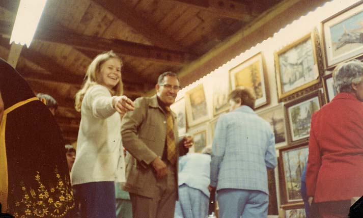 Photo of Reeve Mel Brayman with Libby Campbell at the arts and crafts display of the Cookstown Agricultural Fair in 1977. A number of framed paintings and other passersby are visible in the background.