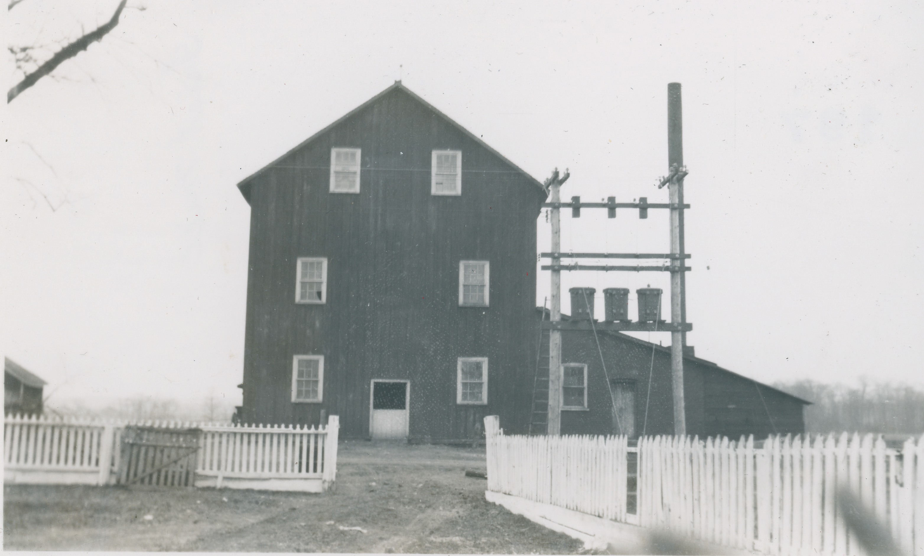 Photo of the front of the Cookstown Mill in an unknown year. It was originally built by J. Spindloe in 1863 and used as a flour mill until 1929, after which it operated as a feed mill. The mill changed ownership numerous times, and was owned by Frank H. Robinson when the photo was taken. Mr. Robinson purchased the property in 1916, and later from 1918-1919 built a home on 7 George Street that would become the home to several of the subsequent mill owners. Mr. Robinson sold both properties on an unknown date to George E. Ross, who then sold again to Frank Fidler and Sandford Sutherland in 1945. The mill and nearby grain elevator were sold once more to Ira Wilson in 1949. The mill itself closed in 1973. The photo shows a tall three-storey building with white window trims and a white picket fence. Not shown is the nearby grain elevator, or the adjacent coal yard where forty ton loads of Reading anthracite coal were shipped for use in Cookstown and area home heating.