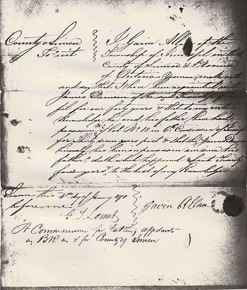 An Affidavit regarding James Duncan, written on January 4th, 1871, by Gavin Allan. County of Simcoe - To Wit:" I, Gavin Allan of the Township of Innisfil,in the county of Simcoe in the Province of Ontario, Yeoman, make oath and say that I have been acquainted with James Duncan of the said Township of Innisfil for over forty years and that to my certain knowledge he and his father have had possession..N 1/2 of Lot No. 18 in 6th concession of Innisfil for 37 years past and that he James Duncan himself, has been in possession ever since his father's death which happened about twenty-four years ago to the best of my knowledge.. Sworn this 4th day of January 1871 before me ....G.L. Lamb Gavin Allan A Commissioner for taking affidavits in ......and for County of Simcoe"