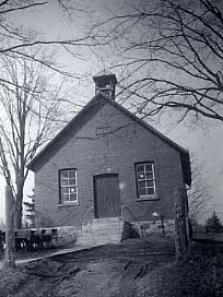 Photo of the exterior of Ross' School in Cookstown. It was one of the early pioneering schools in the area and was a union school built on the corner of the 20th Sideroad and the 14th Line in the Tecumseth section of Cookstown. The photo shows the front entrance to the school and features a traditional bell tower.
