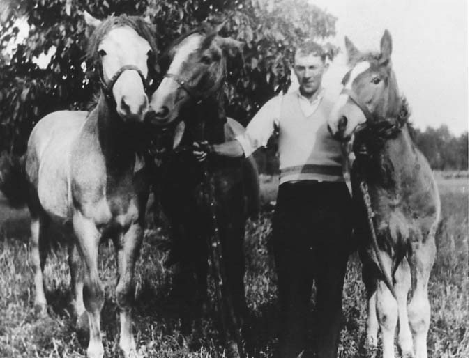 Mr. Jim Reid with colts, at 5th line farm - he is Amelia Quantz' brother and Margaret Quantz' uncle. This picture was taken before he was married. Margaret Quantz is Fred Quantz' daughter. Reid James (Jim). Father of Alvin Reid of Belle Ewart Animals - horses