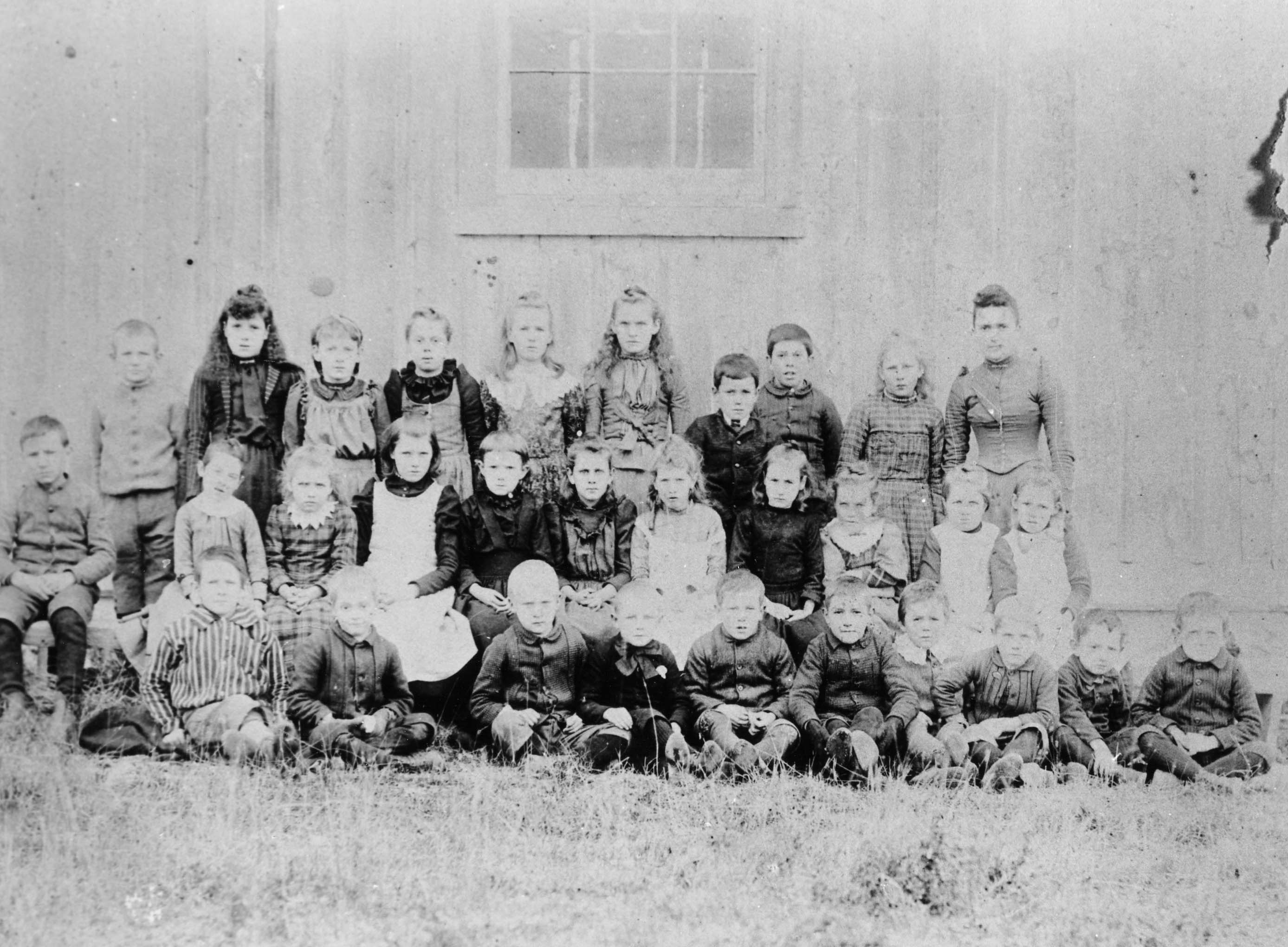 Fifth Line School Pupils: Back row: left to right, Harvey Reid, Jessie Marshall, Winnie Allan ____, Belle Reid, Susie Coulter, Stan Marshall, Harvey Allan, ____, Teacher. Middle row: ____, ____, ____, ____, Jessie Allan, Evelean Sloan, ____, ____, Addie Marshall, Libbie Reid, ____, Front row: Bert Scantelberry, Jim Taylor, William Taylor,William Sloan, Fred Lucus, ____, Milt Reid, ____, Bert Allan, Fred Allan.