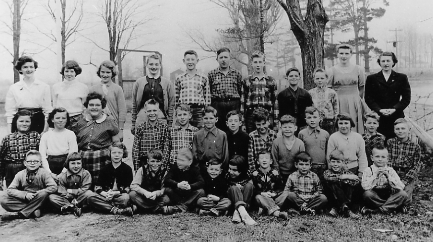 Photo of St. Paul's Public School, class of 1956. Pictured from left to right, front row: Bob Sweezy, Ellen Blundell, Beth Lowe, unknown, Larry Jennett, --- Green, Katharina DeGroat, Brian Jackson, Dennis Hanna, unknown, and David Barber. Second row: Carol Barber, unknown, Edna Kell, Barry Lowe, Dale Pratt, Andy Rowe, Leigh Ransom, Ken Skinner, Dennis Curry, Frank Vander Heyden, June Blundell, Peter Sheridan, and Barry Lowe. Back row: Student teacher Kay Robinson, Diane Hanna, Eileen Sweezy, Ivan Robinson, Brian Pratt, Paul Stunden, Joe Rowe, unknown, student teacher Meg Samsel, and teacher Velma Hubbert.