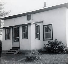 Photo of the exterior of the home of Mr. and Mrs. Herbert "Bert" and Lena (née Nevils) Armstrong, located at 5 East John Street. The couple were married on 15 October 1927. Mr. Armstrong was a veteran of the First World War (CEF # 642612) and worked for a time at Camp Borden. Mrs. Armstrong was the daughter of John J. Nevils. This photo was likely taken in the 1960s or 70s and shows a small, two-storey white house with dark trim around the windows. The front door has three small steps leading up to it and is offset from the house in a small extension/porch. The Armstrongs lived here from 1946 until 1983. Their daughter, Bernice Pendleton, purchased the home in 1956 but Mrs. Armstrong remained living there until she moved to a nursing home in 1983. She died 28 February 1984 at age 84. Mr. Armstrong was born in 1898 and died in 1974.