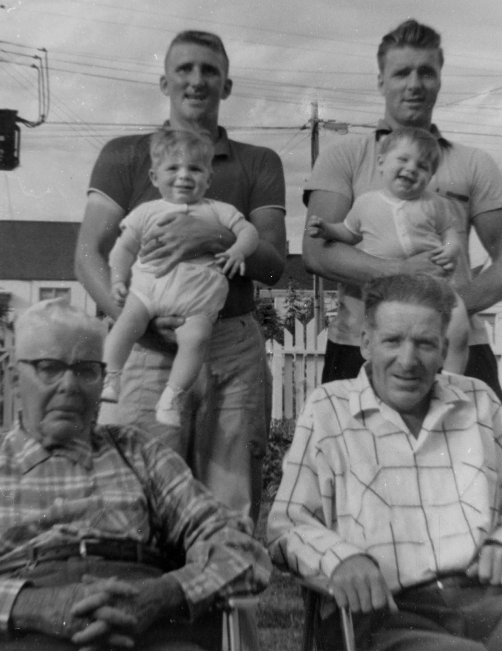 Four generations: Front: left to right: Gilmour Reive and his son Bill Back: (left) Gilmour Reive (son of Bill) with his son Jerry Back: (right) Kenneth Reive (son of Bill) with his son Glen