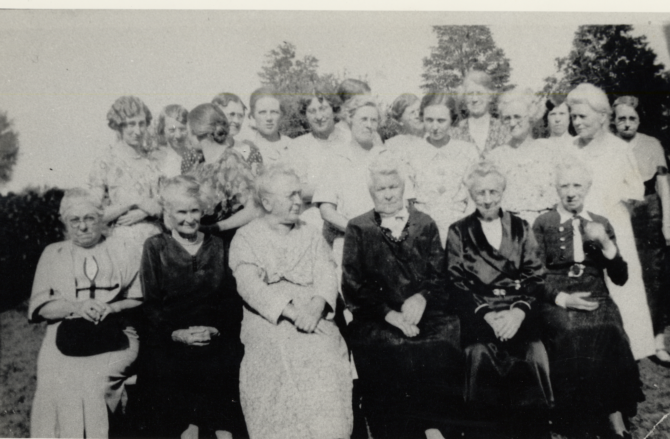 Photo of the St. James United Church Women's Missionary Society of Stroud in 1935. The photo was taken in 1930 or 1935 at William Beelby's Farm. Pictured seated in the front row, from left to right: Annie Wallace, Hattie Orchard, Miss Woolman, Lavine Orchard, Mary Wise, and Mrs. William Beelby. Back row: Frances Wicklum, Clara Beelby, Agnes Marquis, Mrs. L.S. Paisley, Mrs. Roy Goodfellow, Mrs. Garfield Gordon, and Maude Welbanks. The other women pictured are not named.