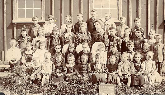 Group photo of the members of Ross' School, Cookstown, taken outside the building in 1893. Ross' school was one of the early pioneering schools in the area and was a union school built on the corner of the 20th Sideroad and the 14th Line in the Tecumseth section of Cookstown. The students pictured are lined up in four rows with the boys in shirtsleeves and girls in dresses. Pictured from left to right, back row: Sam Nixon, S. Speck, F. Davey, W. Speck, John Milligan, H. Campbell, F. Graham, and F. McFadden. Second row (from the back): L. McFadden, N. Chamberlain, Addie Erwin, M. Bunt, L. Beatty, Mrs. Taggart (Teacher), A. Gibson, G. Bunt, J. Duff, K. Graham, and H. Nixon. Third row: J. Duff, M. Apperly, F. Campbell, F. Apperley, E. Duff, U. Campbell, M. Graham, W. Adams, M. Bunt, and J. Parks. Front row: N. Campbell, C. Kell, M. Graham, N. Erwin, L. Speck, B. Campbell, I. Whitesides, W. Kell, M. McFadden, and N. Ross.