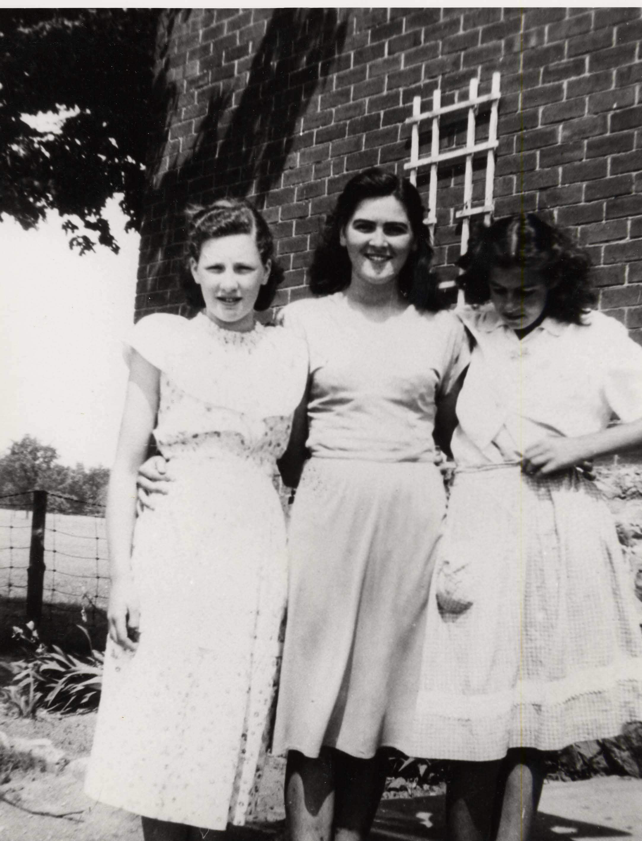 Photo from 1950 of three young eighth grade girls standing outside of Killyleagh School, S.S. #6. Pictured from left to right are Jean McNeill, Doreen Gordon, Kathleen Lagace. In this period, girls in the eighth grade often left school in the middle of the year and therefore did not appear in class photos. These three are wearing short sleeved knee-length dresses and the brick wall of the school building is visible just behind them.