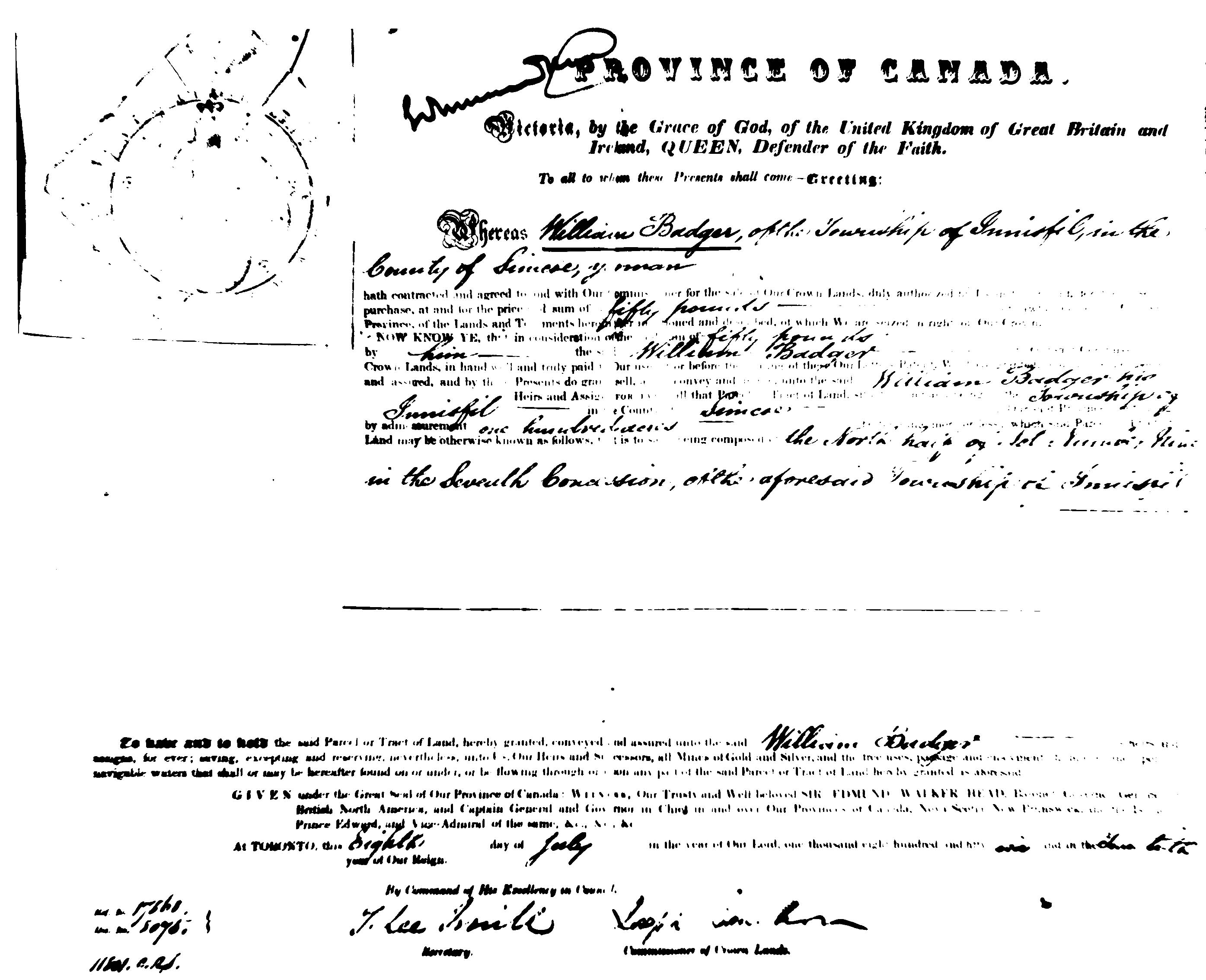 Crown Sale Grant - William Badger - yeoman land grant for N 1/2 Lot 9 Con 7, Thornton, 100 acres. T. Lee Smith: Secretary, Deputy: Thomas Armot?