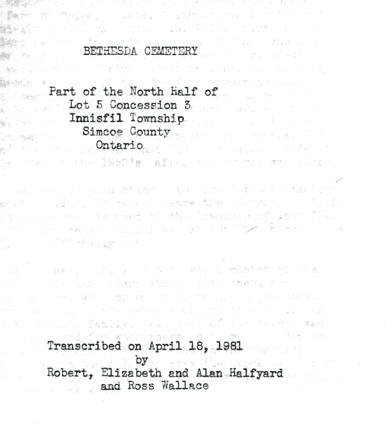 Transcription of a document on the history of plots of Bethesda Cemetery written by Robert, Elizabeth and Alan Halfyard and Ross Wallace. The document was transcribed on 18 April 1981, and the Bethesda Cemetery is located in the north half of Lot 5 Concession 3 of Innisfil. Further information and the full document, as well as other documents pertaining to the maintenance and cost of the cemetery, are available at the Knock Heritage Site.