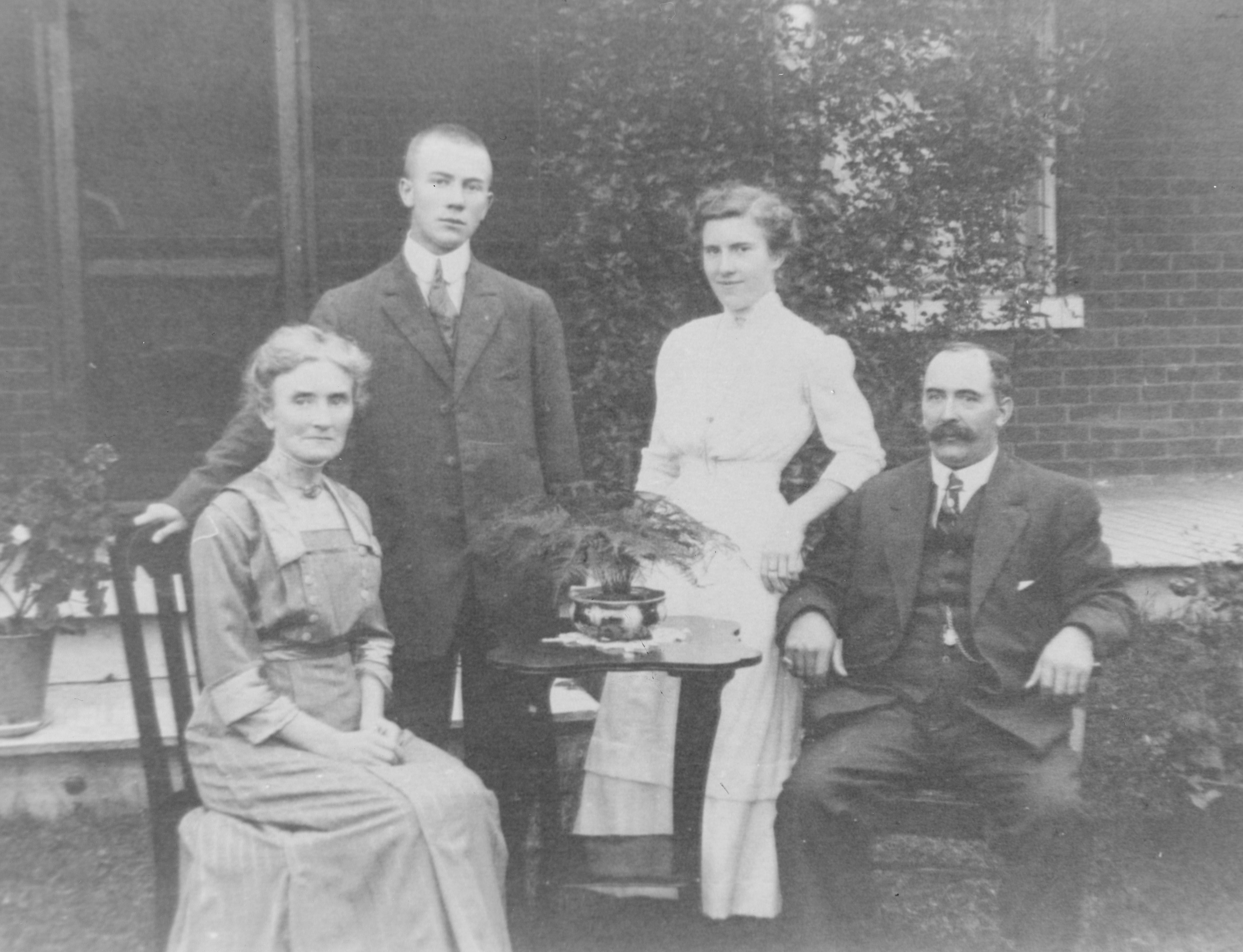 Group photo of Charles Warnica and his family outside of a brick home circa 1900. From left to right are his mother Jennie Warnica (née Galloway, seated), Charles Warnica (standing), his sister Margaret Warnica (standing), and his father Angus Warnica (seated). The family farmed the north half of lot 17, concession 9. Both men are wearing suits and both women are in long sleeved full length dresses. They are surrounding a small table with a potted plant on it. Further information is available at the knock Heritage Site