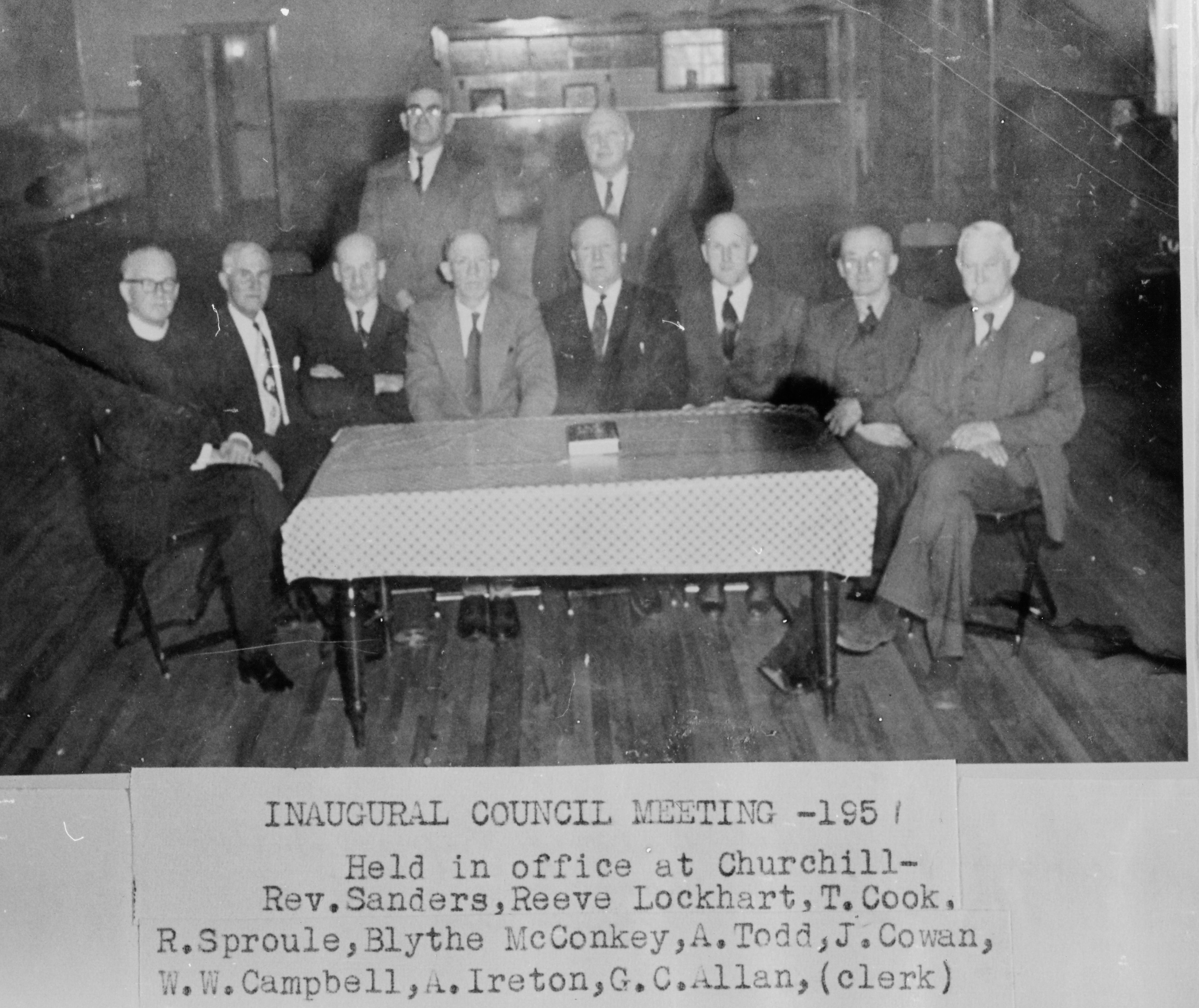 Inaugural Council meeting- Rev. Sanders, Reeve Lockhart, T. Cook, R. Sproule, Blythe McConkey, A. Todd, J. Cowan, W.W. Campbell, A. Ireton, G.C. Allan (Clerk) Page 69 Stroud Tweedsmuir Hist. Vol. II Further information is available at the Knock Heritage Site